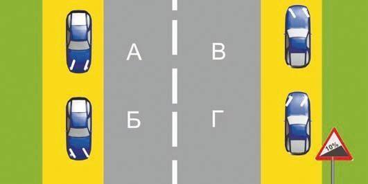 Производя остановку на подъемах (В и Г) или спусках (А и Б) при наличии обочины, водители должны не только использовать стояночный тормоз, но и повернуть колеса в сторону, чтобы избежать самопроизвольного скатывания автомобиля на проезжую часть. Колеса в правильное положение поставили водители автомобилей А и Г. Правильный ответ – 1.