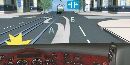 Поскольку установлен знак 5.15.1 «Направления движения по полосам», то он запрещает левый поворот с трамвайных путей. Правильный ответ – 2.