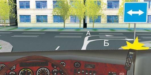 Можно ехать только прямо: для поворота налево или разворота нужно занять крайнюю левую полосу, а поворот направо запрещен, поскольку на пересекаемой дороге с односторонним движением действует противоположное направление. Правильный ответ – 1.