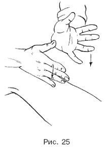 Похлопывание выполняют расслабленной поверхностью ладони и пальцами. Лучше всего выполнять прием одной рукой, расположив ее поперек массируемого участка (рис. 25).