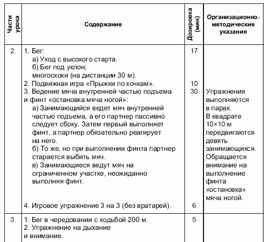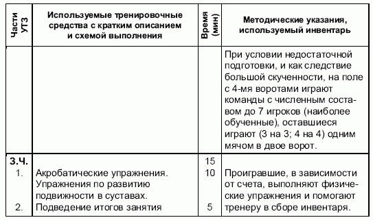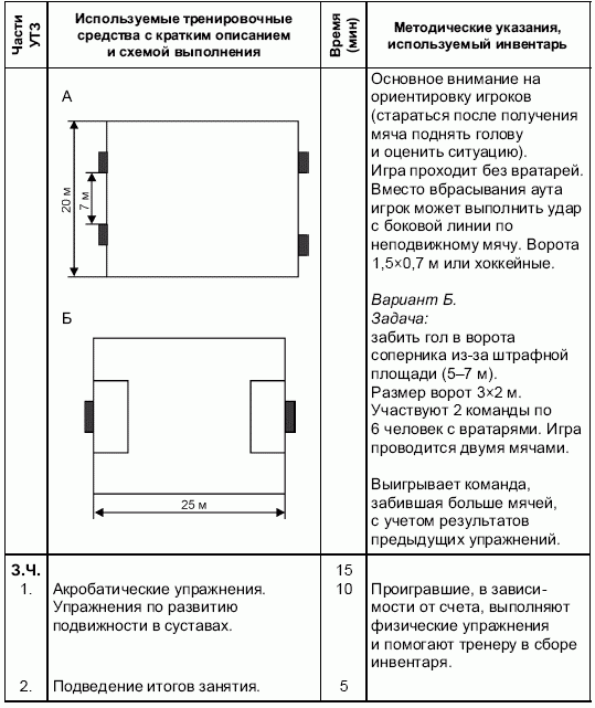 Инвентарь. Ворота 5x2 м, ворота 3x2 м, малые ворота 1,5x0,7м, колпаки большие, колпаки (разметки) малые, барьеры разновысокие, мячи № 4, подвесные мячи, маты.Ряд занятий проводятся по принципу соревновательного метода.