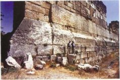 Как только посетитель входит в главные юго-восточные ворота, у него перед глазами оказывается настоящая каменная гора, вздымающаяся вверх цепочкой ступеней и площадок. Поднявшись на несколько ступеней к храму Юпитера, он видит следующий уровень и понимает, что храм стоит не на основной платформе, а на приподнятой площадке в ее северо-западном углу. Площадка называлась «подиумом», была приподнята на шестнадцать футов, что хорошо видно с южной стороны (фото 49 и рис. 114), и состояла из аккуратно обтесанных каменных блоков среднего размера весом в несколько тонн. Эти блоки, в свою очередь, были установлены на тоже искусно обработанных громадных камнях, вес которых оценивается в 500 тонн. Вся эта конструкция опиралась на нижнюю платформу, которая тоже была приподнята над основной, общей для всего священного места площадкой.