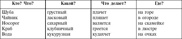 Если дети начали отвечать на вопросы самостоятельно, можно предложить им поиграть. Надо взять лист бумаги, разделить его по вертикали на четыре части и вписать в них вопросы в такой последовательности: кто? что? какой? что делает? где?