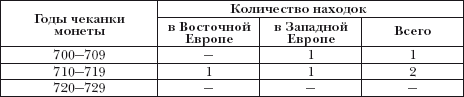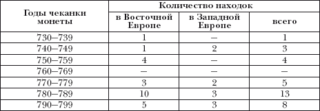 Приведенная таблица дает известные основания судить о той переломной дате, после которой отдельные находки восточных монет в Европе перестают носить случайный характер. Из 37 отдельных датированных находок таких монет – 25 относятся к последней четверти VIII в. Они начинают встречаться постоянно после 774 г. Хронологический диапазон остальных 12 находок достигает сотни лет, а распределение их по десятилетиям носит такой характер, что случайность их очевидна; это не случайность проникновения куфических монет в Европу уже в первой половине и в середине VIII в., а случайность попадания в землю ранних монет в более позднее время.