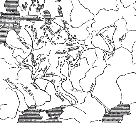 Рис. 5. 1 – Кривянская, 806 г.; 2 – Завалишино, 810 г.; 3 – Нижняя Сыроватка, 813 г.; 4 – Паристовский хутор; 5 – Ярыловичи, 821 г.; 6 – Литвиновичи, 824 г.; 7 – Могилев, 815 г.; 8 – Минская губ., 816 г.; 9 – Лапотково, 817 г.; 10 – Баскач; 11 – Борки, 817 г.; 12 – Скопинский у.; 13 – Сарское городище; 14 – Угодичи, 813 г.; 15 – Углич, 829 г.; 16 – Загородье, 831 г.; 17– Семенов Городок; 18 – Демянск, 825 г.; 19 – Набатово; 20 – Вылеги; 21 – Тарту; 22 – Старая Ладога, 786 г.; 23 – Княщино, 808 г.; 24 – Элмед, 821 г.; 25 – Лелеки